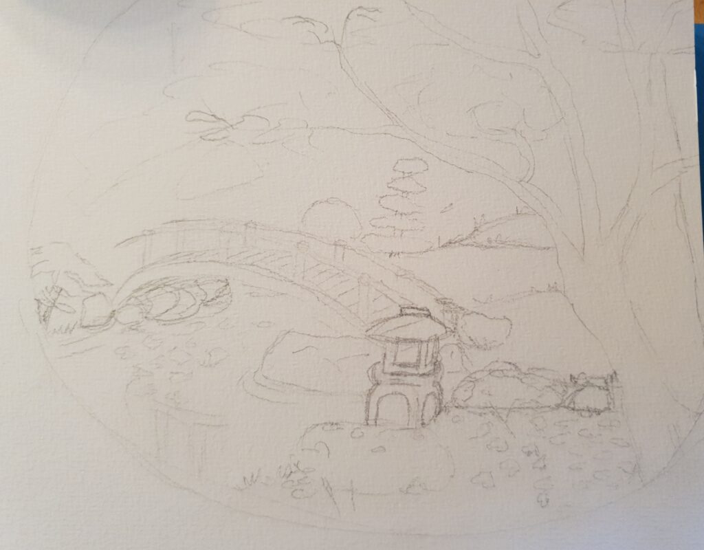 Deze tekening was nog niet in de goede verhouding, dus omrekenen. Daarna de elementen schetsen. De brug kwam in de tuin, een heuse Japanse tuin in de herfst. Want een beetje draak heeft natuurlijk een Japanse tuin 😉.