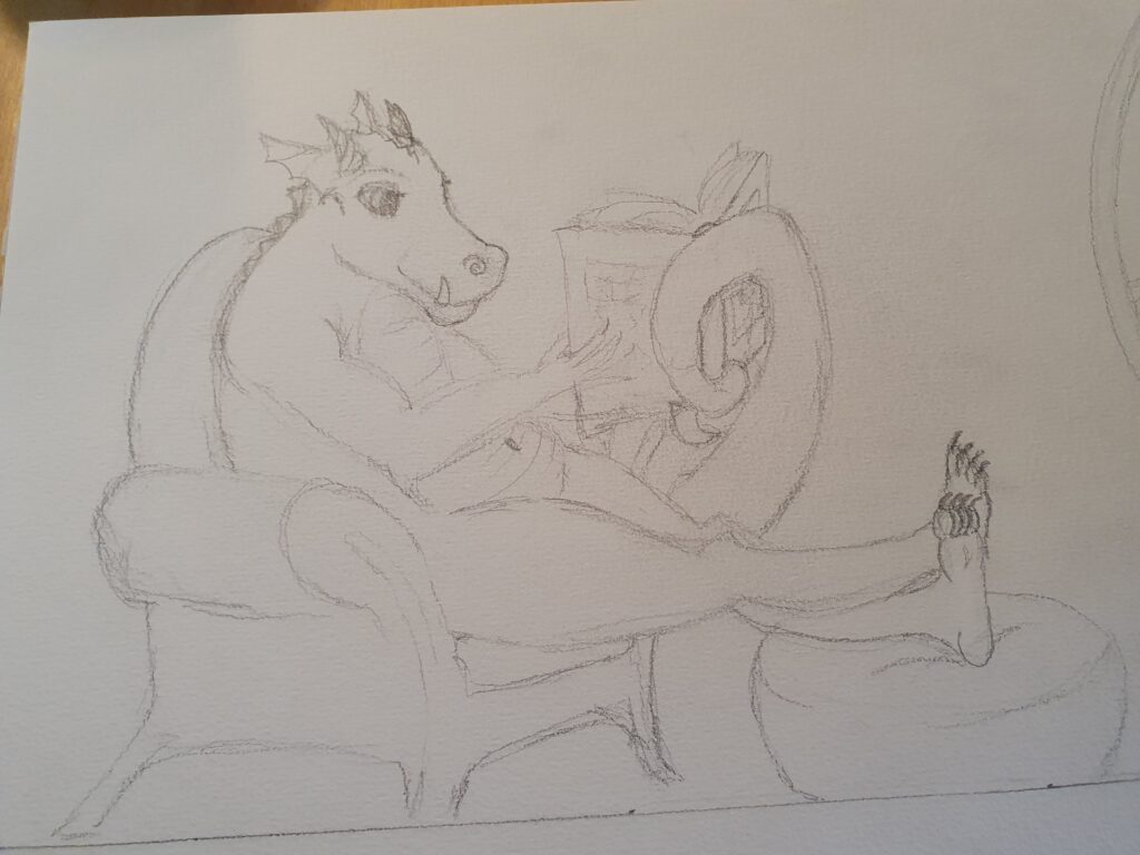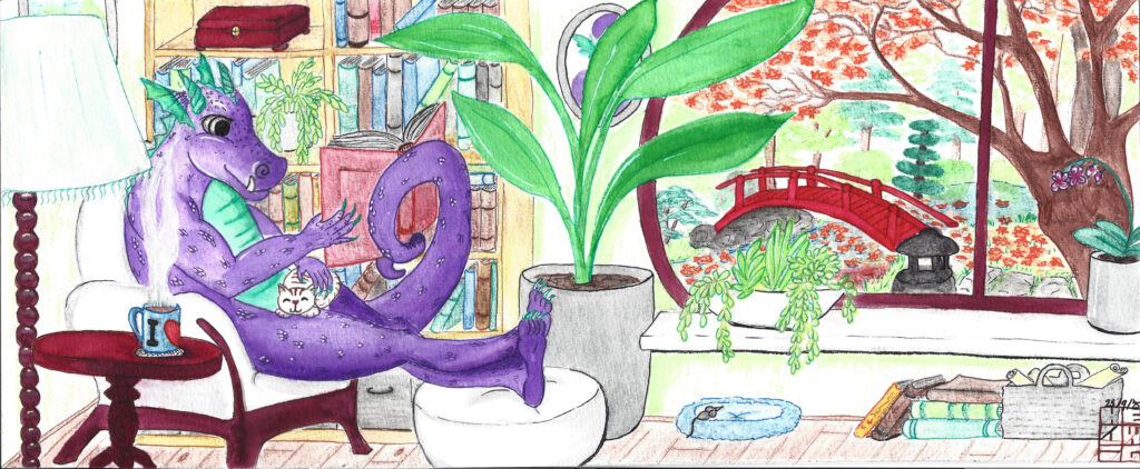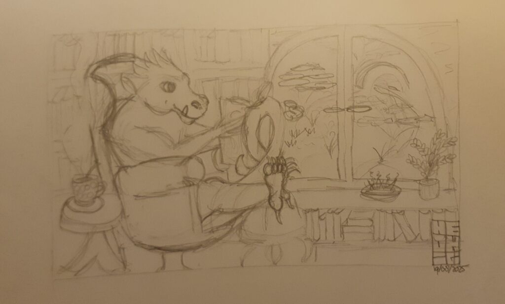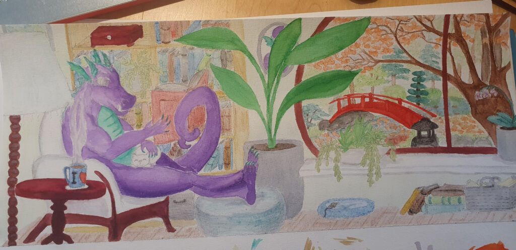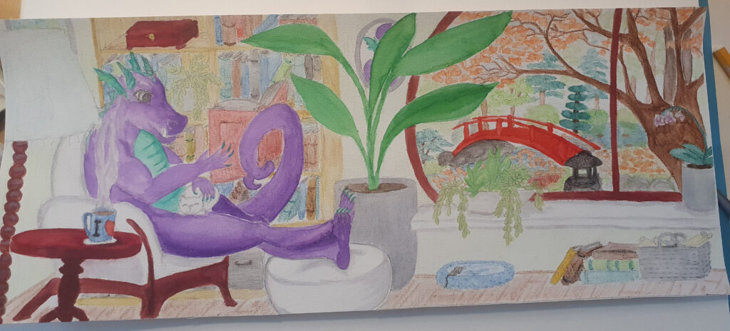 Wat leuk dat ik gevraagd ben om de banner voor de herfst te maken voor de Fantastische Unie. En tegelijk ook heel eng! Ik ben nog niet zo lang bezig. Mijn inspiratie kwam eigenlijk van de herfst zelf. Ik wilde iets knus illustreren waarbij je een gevoel kreeg dat het buiten alleen maar kouder wordt en het binnen aangenaam vertoeven is. Na het formaat omrekenen, de eisen en mijn ideeën op papier te hebben gezet, kwam het eerste beeld al snel in me op. Het werd een draak. Met een boek, natuurlijk! Ook wilde ik een brug in mijn ontwerp. Ik werk graag analoog voor mijn tekeningen.
