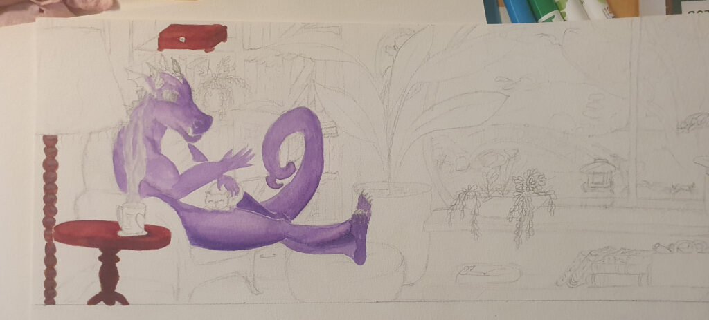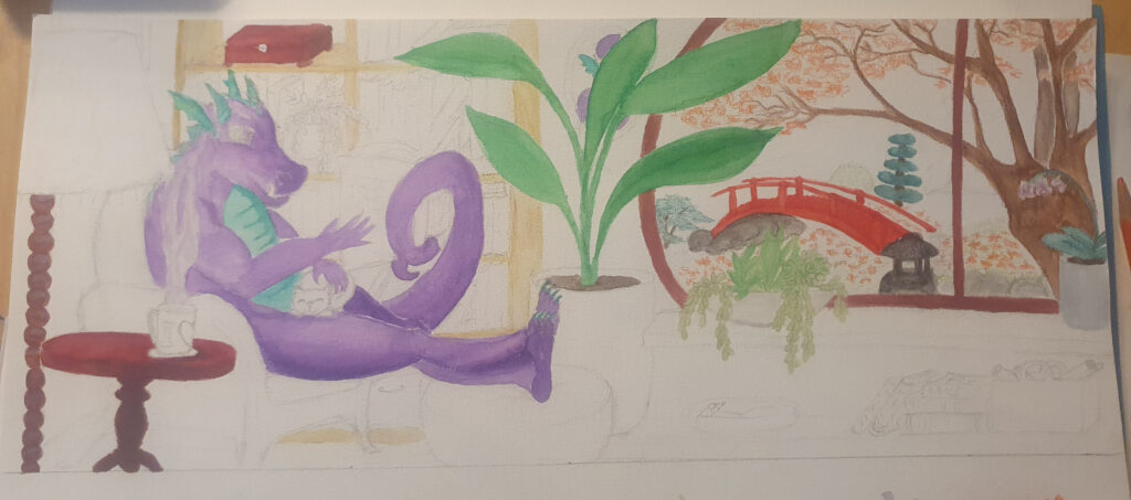 En toen de schets in goede verhouding klaar was aan de slag met kleur. Lastig, want de kleuren van de Fantastische Unie moeten er goed uitkomen en ik wil ook herfstkleuren. Aan de draak de eer de FAUN-kleuren te dragen. Verder heeft alles zijn soort van natuurlijke kleur. Ik begon met kleurpotlood, maar stapte al snel over op aquarel.
